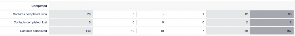 • Contacts Completed, Won: il numero di contatti gestiti su cui l’agente a concluso delle vendite, andate a buon fine