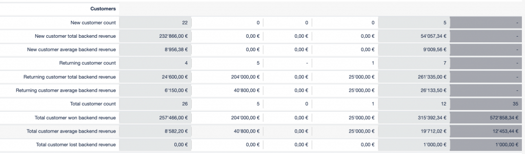 • New Customer Total Backend Revenue: il guadagno totale derivante da vendite di backend, generato dai nuovi clienti