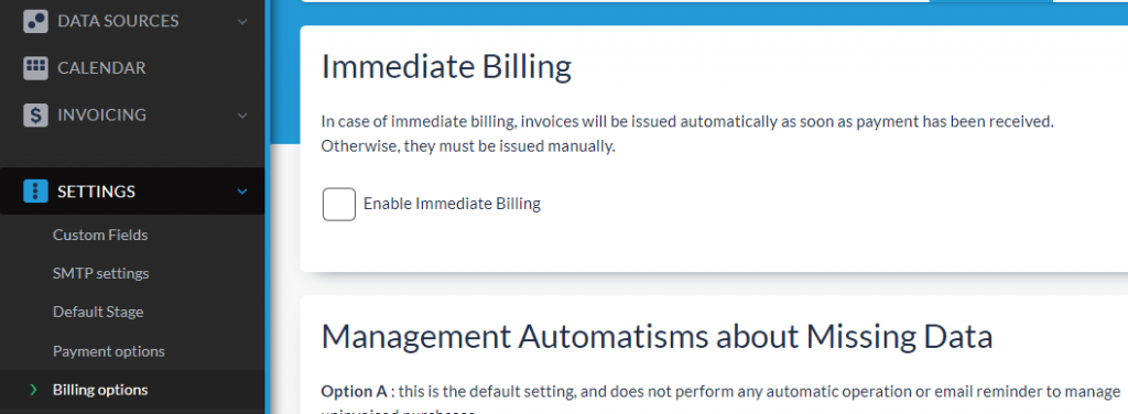 - In “Billing Options“, after you have tested a couple of emission manually, you can tick the “Enable Immediate Billing“ checkbox: now all the invoices will be automatically emitted once all the data have been inserted by the customer.