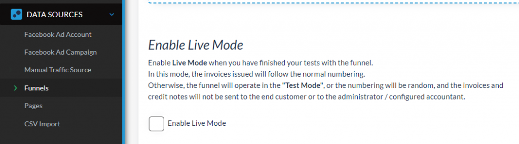 In the “Data Sources” > “Funnel” page, select the funnel you want to put in test mode, open it by pressing the pen icon and check that, under the menu “Fiscal Settings“, the checkbox “Enable Live Mode” is not enabled.