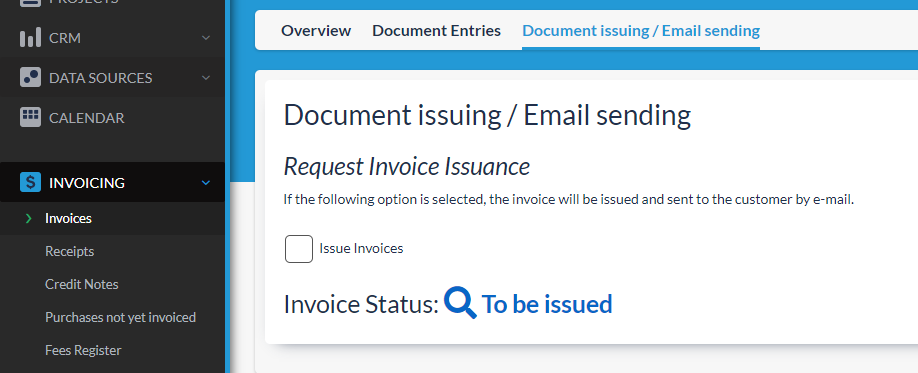 To manually emit an invoice and make sure a copy is sent to the customer, you just need to press the pen icon to open the invoice, navigate to “Document issuing/Email sending“, click on the “Issue Invoices” checkbox and then save the page. Before emitting it, you can also click on the magnifying glass icon underneath to see a preview of the invoice.
